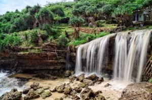 Sepanjang jalan masuk ke Pantai Jogan, Anda akan terlihat sungai kecil yang mengalir, itu adalah cikal bakal dari air terjun Jogan. Air sungai tersebut berasal dari perbukitan karst yang ada di Gunungkidul, Yogyakarta. Saat musim hujan, air terjun ini akan terlihat semakin cantik karena debit air yang mengalir menjadi lebih besar.