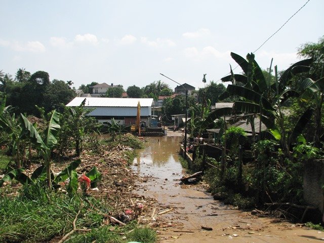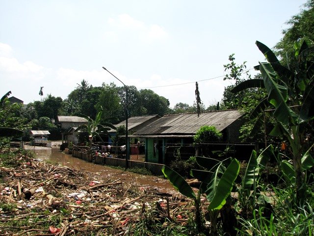 Kondisi ini diperparah dengan tumpukan sampah yang terbawa aliran air dan tersangkut di jembatan, dan juga badan kali mengalami penyempitan karena longsornya turap Tempat Pembuangan Akhir (TPA) Cipayung di bagian hilir jembatan. Aliran air akhirnya tersendat dan meluber ke tepian kali, selain jalan dan rumah, air juga merendam kebun-kebun tempat pemeliharaan sapi, hingga kamis siang permukaan air masih tinggi.(Hendra**)