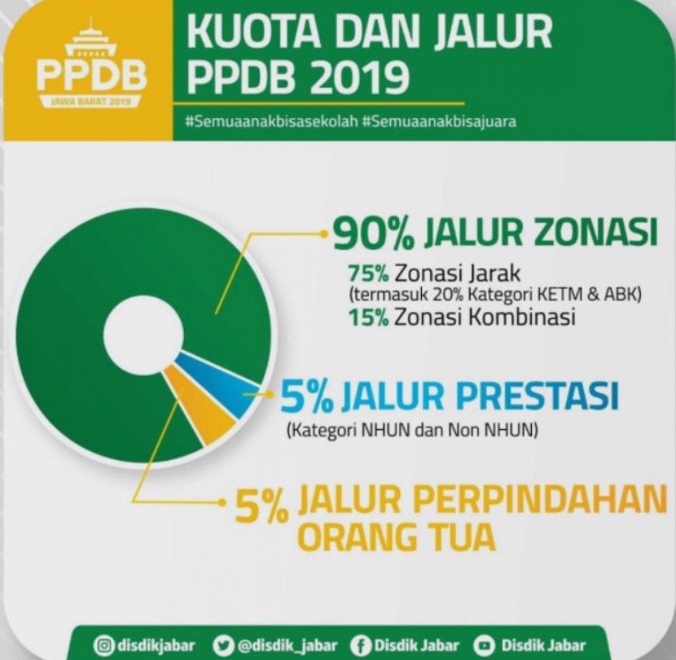 PPDB 2019 berbeda dari tahun sebelumnya. Tahun ini kuota penerimaan zonasi jarak sebanyak 75%, zonasi kombinasi 15%, jalur prestasi 5%, jalur perpindahan orang tua 5%./(odt)
