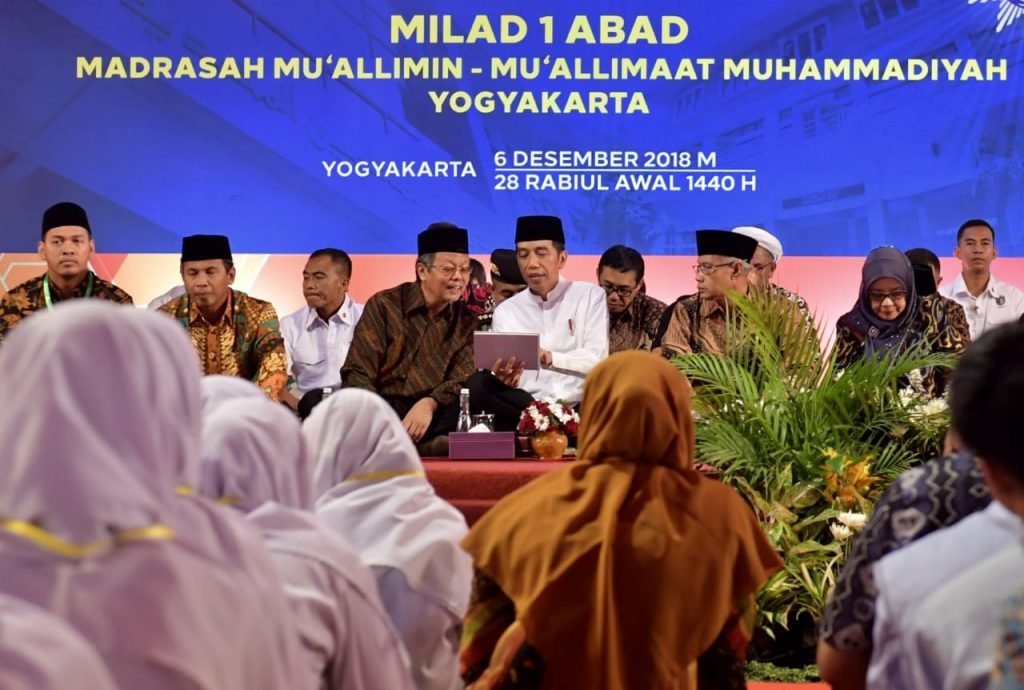 SUARA JABAR SATU.COM | JOGJAKARTA – Presiden Joko Widodo menghadiri peringatan Milad Satu Abad Madrasah Mu’allimin-Mu’allimaat Muhammadiyah di Gedung Madrasah Mu’allimin Muhammadiyah, Wirobrajan, Kota Yogyakarta, Kamis (6/12/2018).