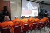 SUARA JABAR SATU.COM | – Sejumlah tersangka dihadirkan saat rilis pengungkapan tindak pidana perdagangan orang di Bareskrim Polri, Jakarta, Kamis (13/9).