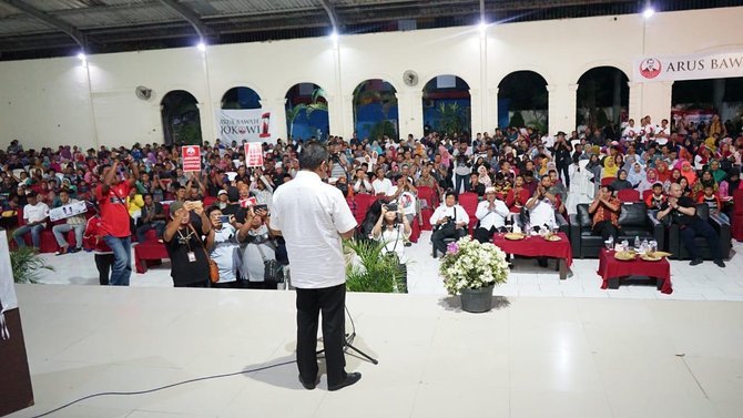 Ribuan relawan yang memenuhi gedung pertemuan Hotel Mahkota menyatakan tekad dan komitmennya untuk pemenangan Jokowi pada Pilpres 2019.