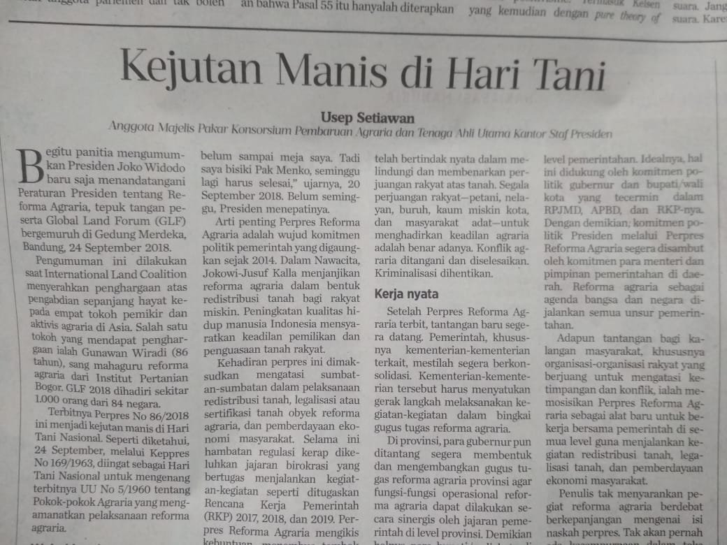 Terbitnya Perpres No 86/2018 ini menjadi kejutan manis di Hari Tani Nasional. Seperti diketahui, 24 September, melalui Keppres No 169/1963, diingat sebagai Hari Tani Nasional untuk mengenang terbitnya UU No 5/1960 tentang Pokok-pokok Agraria yang mengamanatkan pelaksanaan reforma agraria.