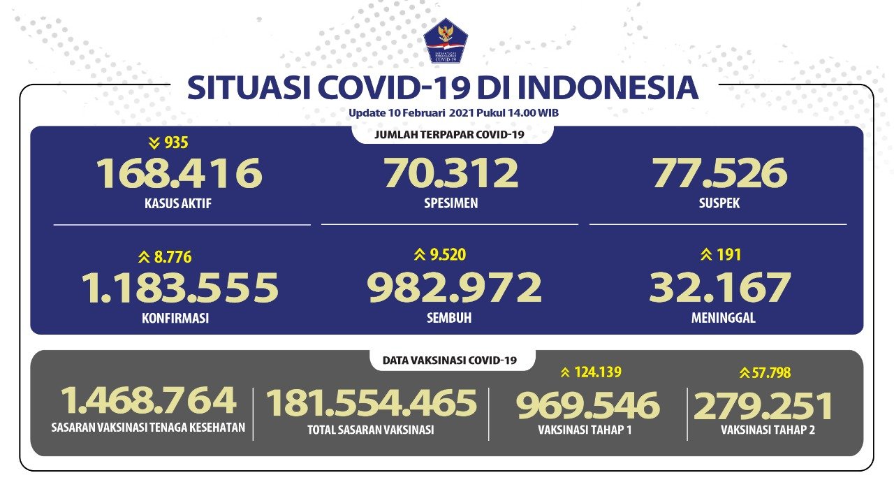 SUARAJABARSATU.COM | JAKARTA – Perkembangan penanganan COVID-19 per 10 Februari 2021, pasien sembuh harian bertambah lagi sebanyak 9.520 orang. Penambahan hari ini meningkatkan jumlah kesembuhan kumulatif mencapai 982.972 orang dengan persentasenya sebesar 83,1%.