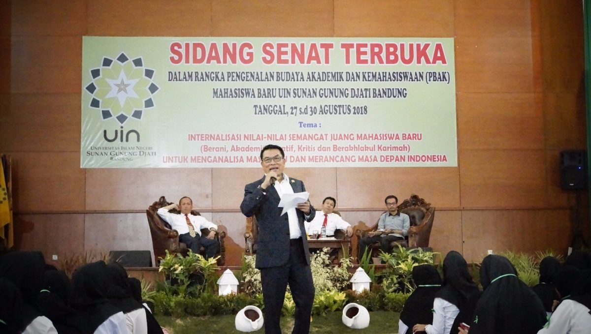SUARA JABAR SATU.COM | BANDUNG – Kemandirian Nasional di era pemerintahan Jokowi-JK menjadi pesan sentral yang disampaikan Kepala Staf Kepresidenan Moeldoko yang juga dihadiri juga oleh Rektor Universitas Islam Negeri Sunan Gunung Djati Bandung, Prof. Dr. H. Mahmud, M.Si., dan 6.000 mahasiswa baru UIN, di Bandung, 27 Agustus 2018.