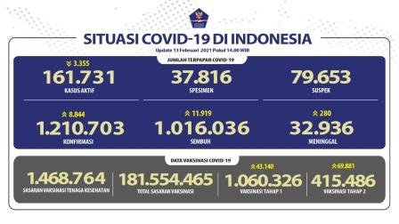 SUARAJABARSATU.COM | JAKARTA – Perkembangan penanganan pandemi COVID-19 per 13 Februari 2021, pasien sembuh sudah melebihi angka 1 juta orang atau angka tepatnya bertambah menjadi 1.016.036 orang dengan persentasenya sebesar 83,9%. Peningkatan angka kumulatif ini dengan adanya penambahan pasien sembuh harian sebanyak 11.919 orang.