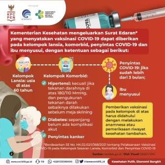 SUARAJABARSATU.COM | JAKARTA –Pemerintah melalui Kementerian Kesehatan menetapkan vaksinasi COVID-19 dapat dilakukan pada kelompok lansia, komorbid, penyintas COVID-19 dan ibu menyusui dengan syarat tertentu. Hal ini tertuang dalam Surat Edaran Nomor HK.02.02/I/368/2021, tanggal 11 Februari 2021, tentang Pelaksanaan Vaksinasi COVID-19 pada Kelompok Sasaran Lansia, Komorbid dan Penyintas COVID-19, serta Sasaran Tunda