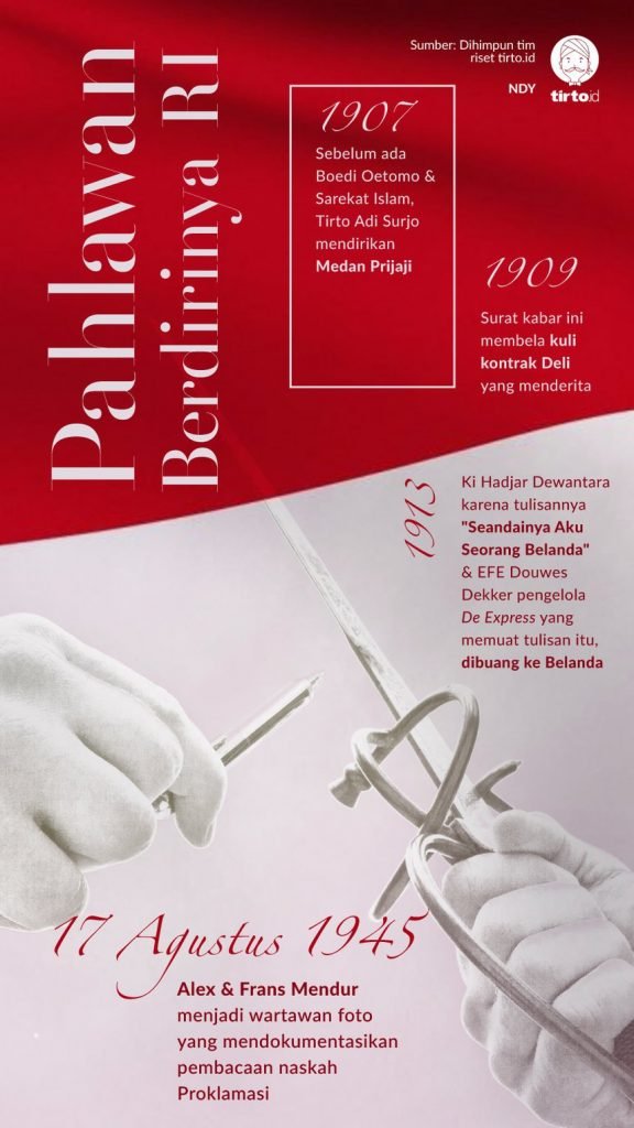 Tirto Adhi Soerjo adalah salah satu contohnya. Jebolan sekolah kedokteran STOVIA ini mendirikan surat kabar Medan Prijaji pada 1907. Dia memilih terjun ke dunia jurnalistik ketimbang jadi dokter seperti kebanyakan kawan sekampusnya. Dia sadar rakyat Indonesia tidak hanya butuh diobati luka fisiknya, tapi perlu dibangun kesadarannya. Tak kalah penting, Tirto mengabarkan para kuli yang menderita di Deli, Sumatra Timur.