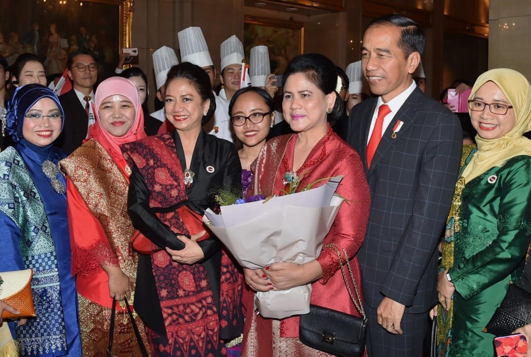 Di hotel, Menteri Luar Negeri Retno Marsudi menyambut kedatangan Presiden dan Ibu Iriana. Tampak pula dua orang putra-putri Indonesia berpakaian adat menyambut kedatangan Presiden Jokowi dan Ibu Iriana seraya memberikan bunga sebagai ucapan selamat datang./hdr.-