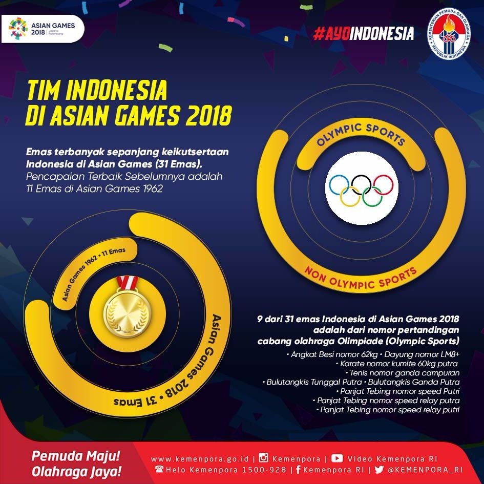 Dengan capaian ini, Indonesia melampaui target minimal 16 medali emas yang dicanangkan pemerintah sejak awal untuk bisa berada di peringkat 10 besar Asian Games 2018. Sebanyak 9 dari 31 emas yang berhasil diraih Indonesia, berasal dari cabang olahraga yang dipertandingkan di Olimpiade (Olympic Sports), dan 22 emas dari cabang Non-Olympic Sports.