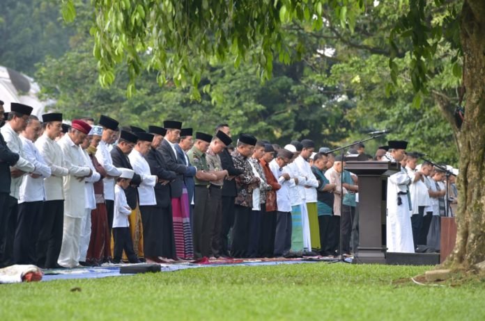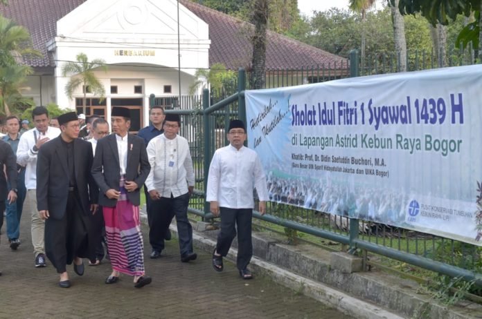 SuaraJabarSatu.com | Bogor – Presiden Joko Widodo dan Ibu Negara Iriana Joko Widodo melaksanakan salat Idulfitri di Lapangan Astrid, Kebun Raya Bogor, Jumat, 15 Juni 2018. Tampak hadir juga Kahiyang Ayu beserta Bobby Nasution.