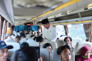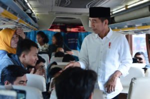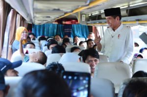 Presiden yang mengenakan kemeja putih dan peci hitam tiba pukul 14.20 WIB. Ia kemudian naik ke salah satu bis yang telah penuh terisi. Kedatangan Kepala Negara ini pun disambut meriah para pemudik dan masyarakat sekitar.