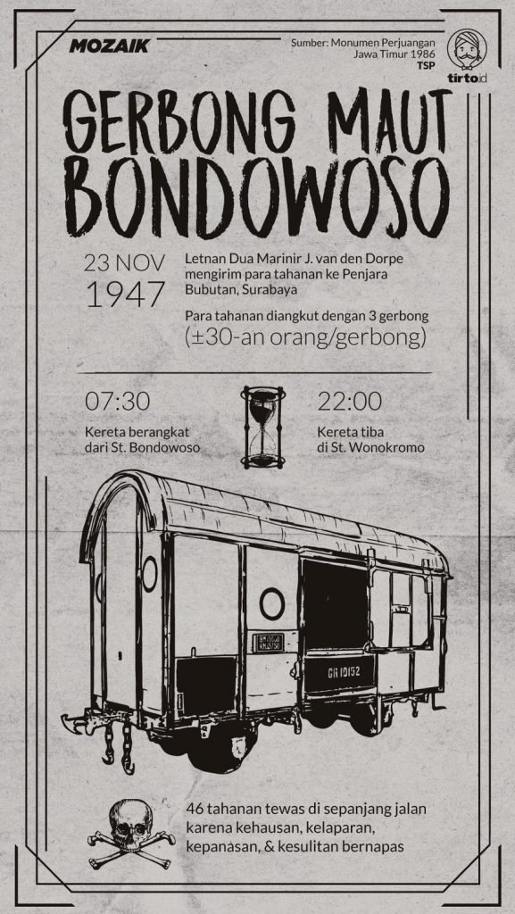 46 pejuang Republik yang ditawan Belanda tewas di dalam gerbong yang pengap. Mereka berangkat dari Bondowoso menuju Surabaya.