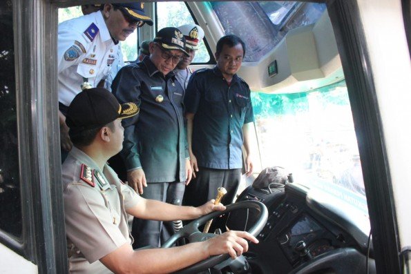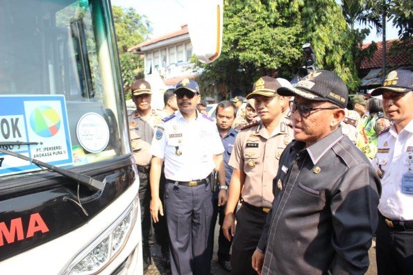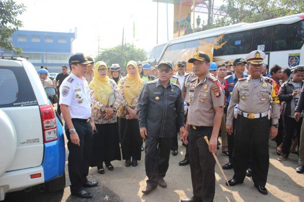SuaraJabarSatu.com | Depok – Wali Kota Depok, Mohammad Idris bersama Kapolresta, Kepala Dinas Perhubungan, Kepala Dinas Kesehatan dan Kepala Dinas Pemadam Kebakaran dan Penyelamatan Kota Depok melakukan pemerikasaan kelayakan kendaraan (ramp check) terhadap angkutan penumpangan antar kota dan antar provinsi kelas ekonomi yang berada di terminal Depok, Kamis (31/05/2018). Kegiatan tersebut dilakukan dalam rangka menyambut arus mudik lebaran. tahun 2018.