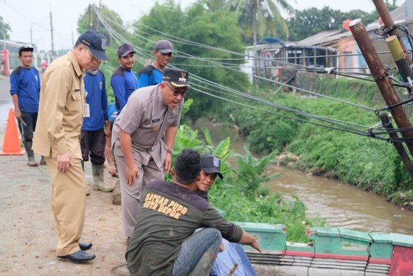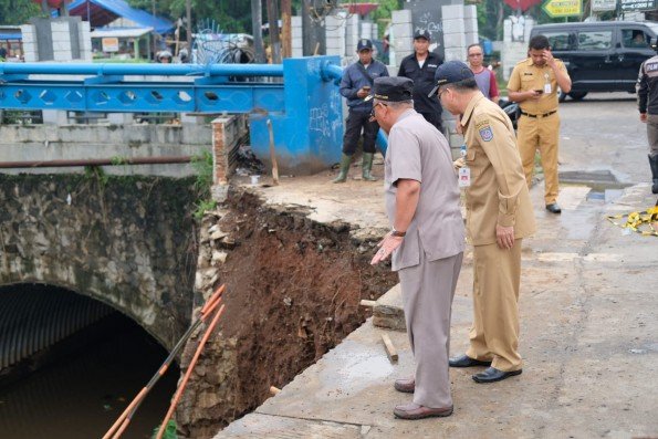 SUARA JABAR SATU.COM | DEPOK — Wali Kota Depok, Mohammad Idris didampingi Kepala Dinas Pekerjaan Umum dan Penataan Ruang (PUPR) Kota Depok, Manto meninjau lokasi longsor di Jl. Raya Citayam, Kelurahan Ratujaya, Kecamatan Cipayung, Senin (12/11/2018).